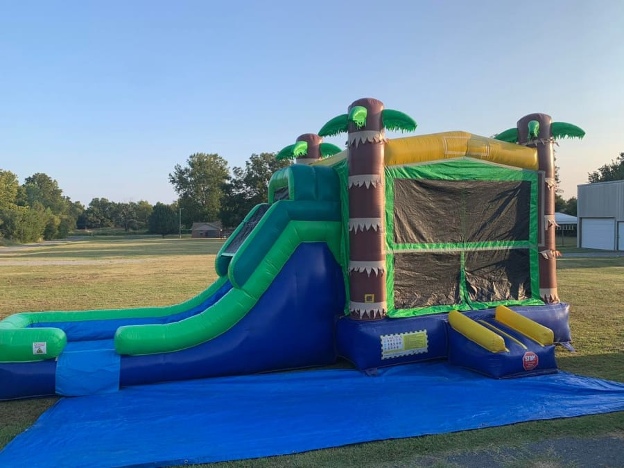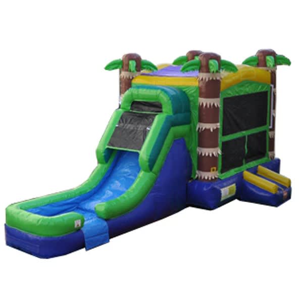 The Single Lane Palm Combo delivers instant summer fun. This inflatable combo pairs a spacious bounce area with an attached basketball hoop and a single inflated slide. Use it wet or dry for versatile entertainment at backyard parties, block events, or weekend rentals. Easy to set up. Loads of smiles. ๐